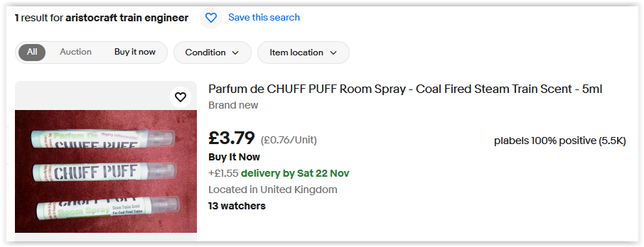 I can't now remember which other settings and filters were in use, but a search for "Aristocraft Train Engineer" on ebay this morning produced this single "match" . . .