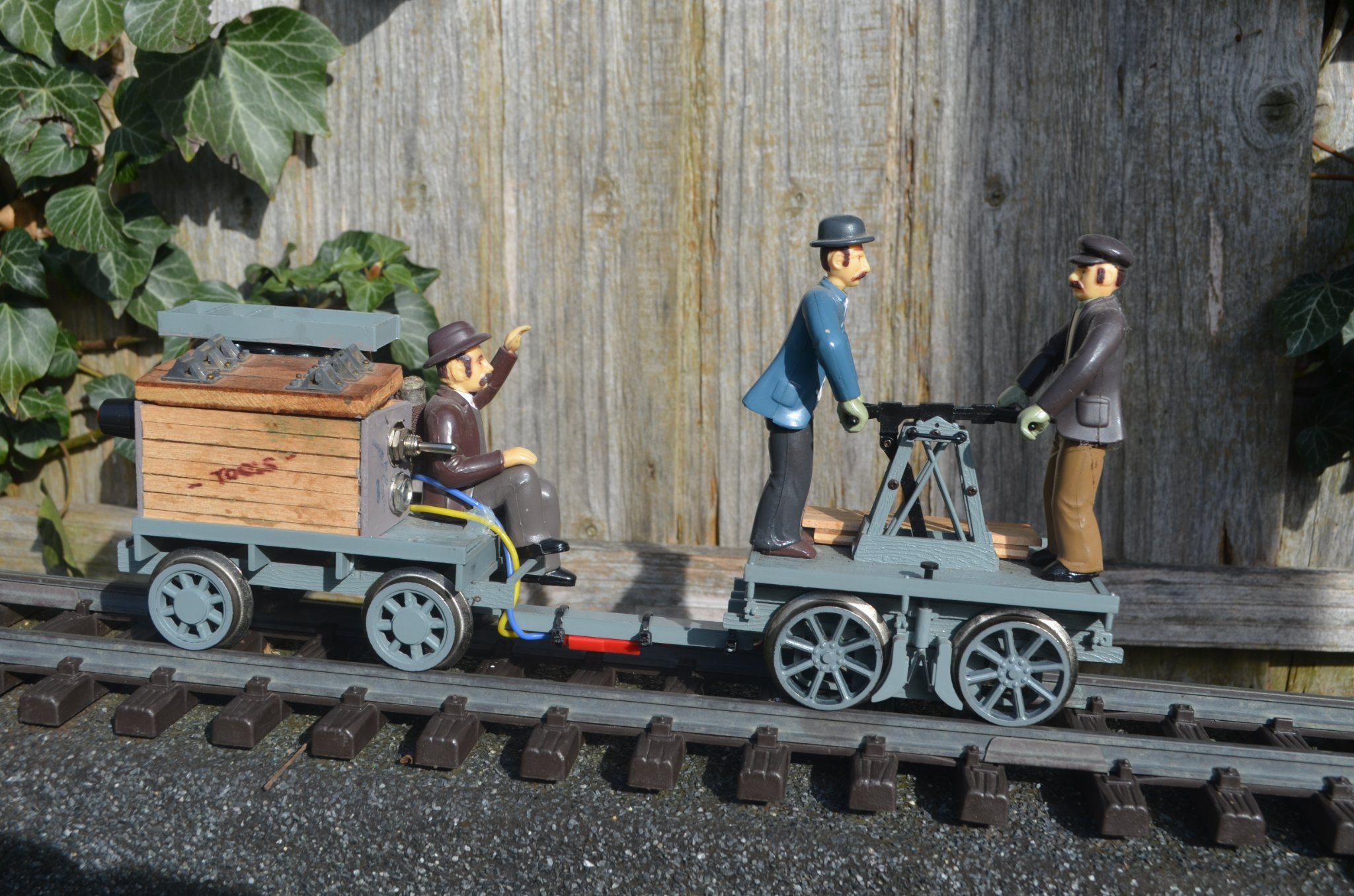 The Boss talks to Dai whilst Abner prepares for more back breaking toil.image.jpeg The CFR "Gandy Dancer" has been very busy today. It operated from 9am to 3pm and covered an actual 8 miles on one charge. Operation was only curtailed due to debris falling from the trees onto the track.