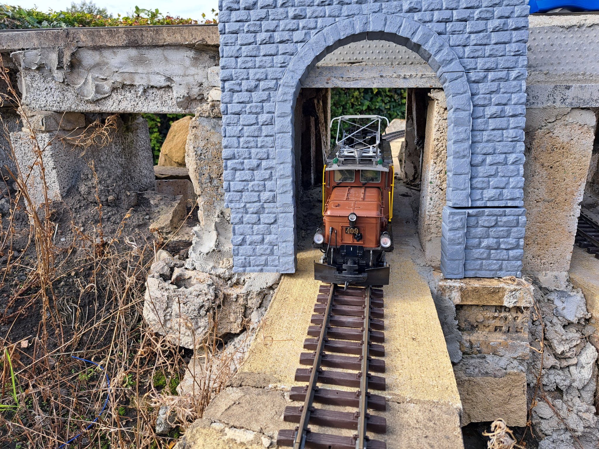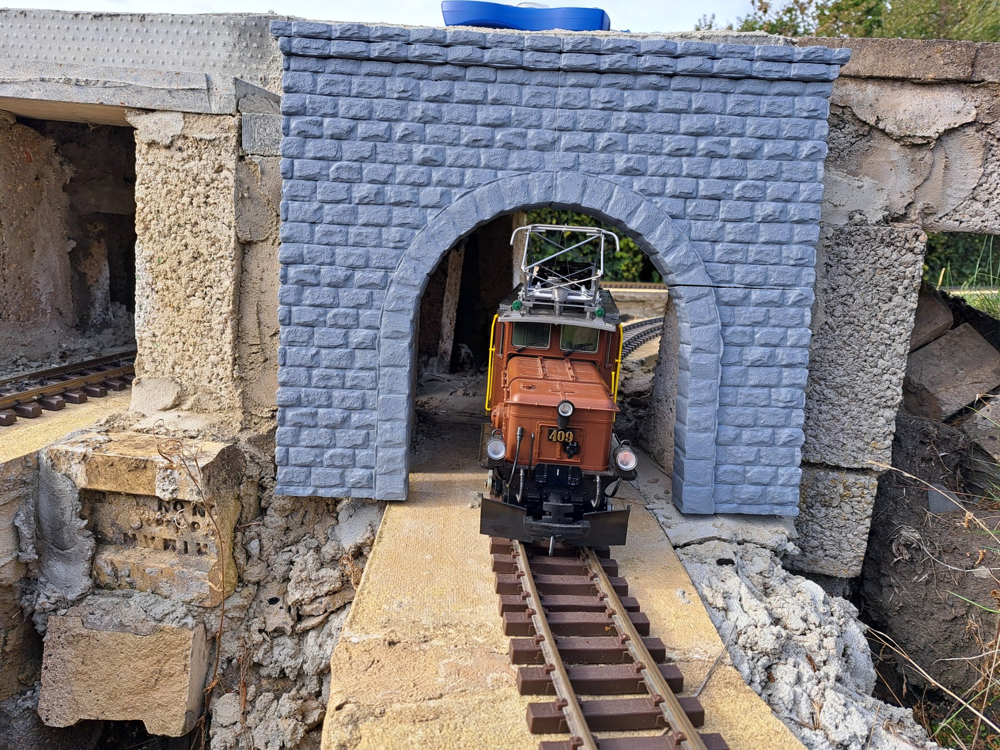 ...from my prospective with teathered pantographs (with fishing line as seen in the middle of the pantograph.) in order to fit through the LGB girder bridge, I should get away with just the prototype, without using the extension pieces. I may also have made a basic adding error in my height calculation for the extension pieces, but I am sure they can be trimmed if need. Not sure if I will paint them or not, but as I have said it's something for next year.