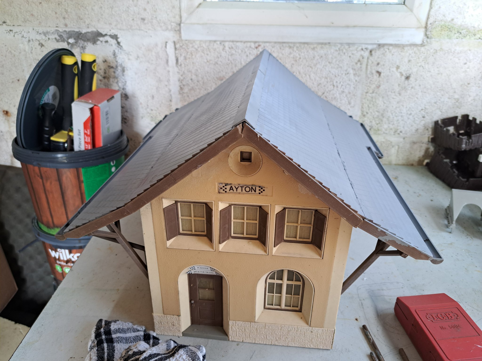 ...after a spray of a laquer over the whole roof, the station building is now home. For how long as after many years outside I am considering a total referb (read into that replacement), if Christmas is good to me.