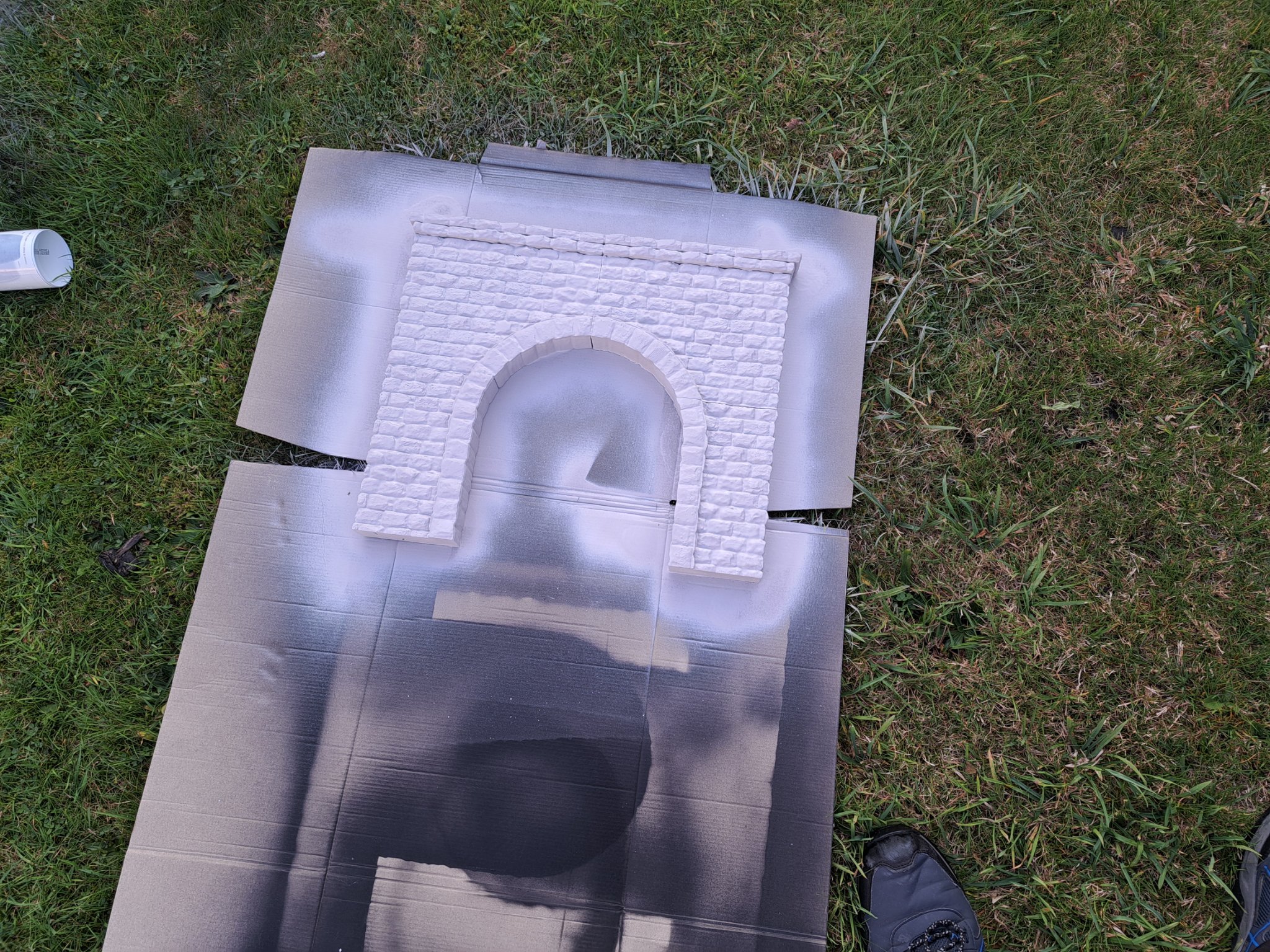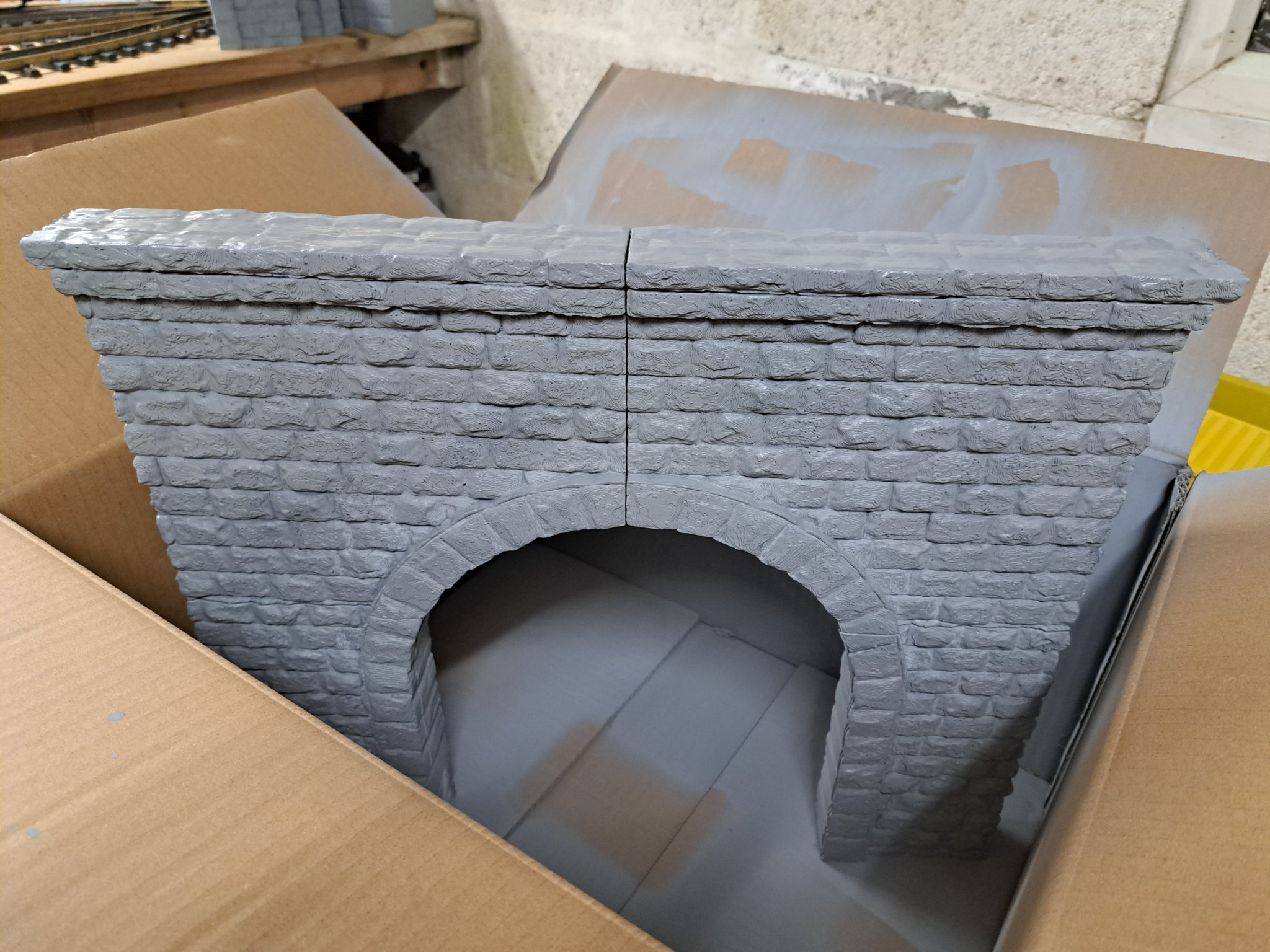 I also turned my hand to the tunnel mouths, looking for a grey stone finish, so I bought a tin or two of darkish grey "concrete" paint...