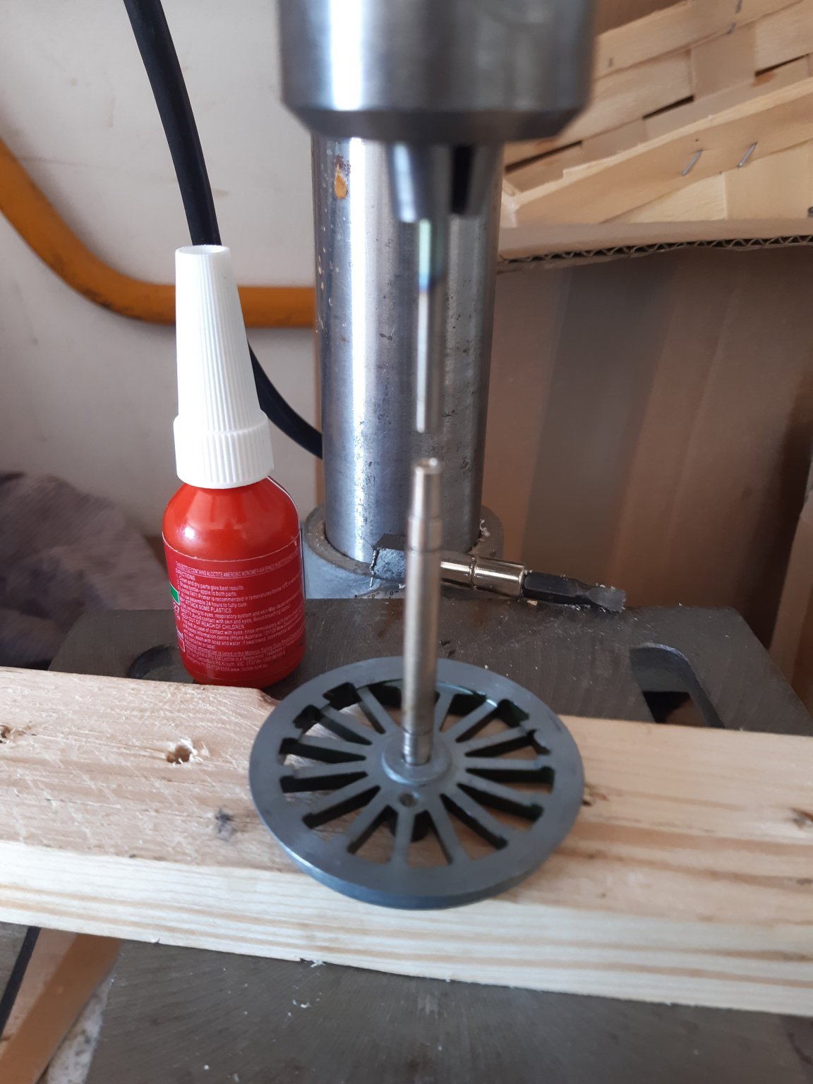 Following the one thing at a time approach I decided to do either side of wheelsets separately so there be only one loose wheel to be adjusted at a time. After duly degreasing the joints I used the drill press with a matching drill - inverted, of course.