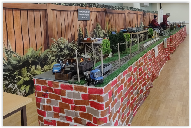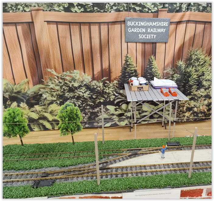 It's always difficult to impart a "garden railway feel" when exhibiting a layout in an exhibition hall. The Whiteleaf Railway/Tramway layout is set at a level appropriate to a railway built on a low wall in the garden (much appreciated by children and those in wheelchairs), with curtains representing brickwork, but at Exeter we added a new feature with a "fence and foliage" backdrop behind the operating area . . .