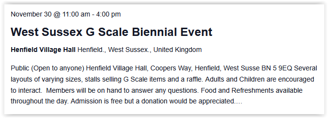 We are still debating how many exhibitions we will be able to attend in 2026, due to the dwindling numbers of those of us remaining fit enough to deliver, put up and take down the layout. What we need is some "new blood". Any volunteers? We've been invited to the London Festival of Railway Modelling in March 2026 (standing annual invitation, because with a modular layout, we can take something different each year, whereas most clubs only get invited every two or three years) . . . and see that mainstream model railway show (assuming we attend in 2026, and get invited again in 2027) as the best place for us to contribute to the G Scale Society's 40th Anniversary celebrations in 2027. Crystal ball, anyone?