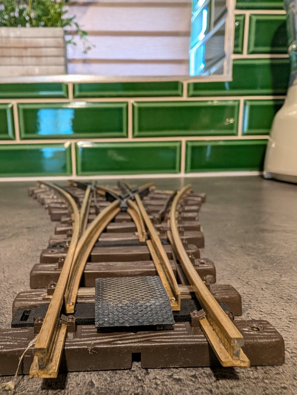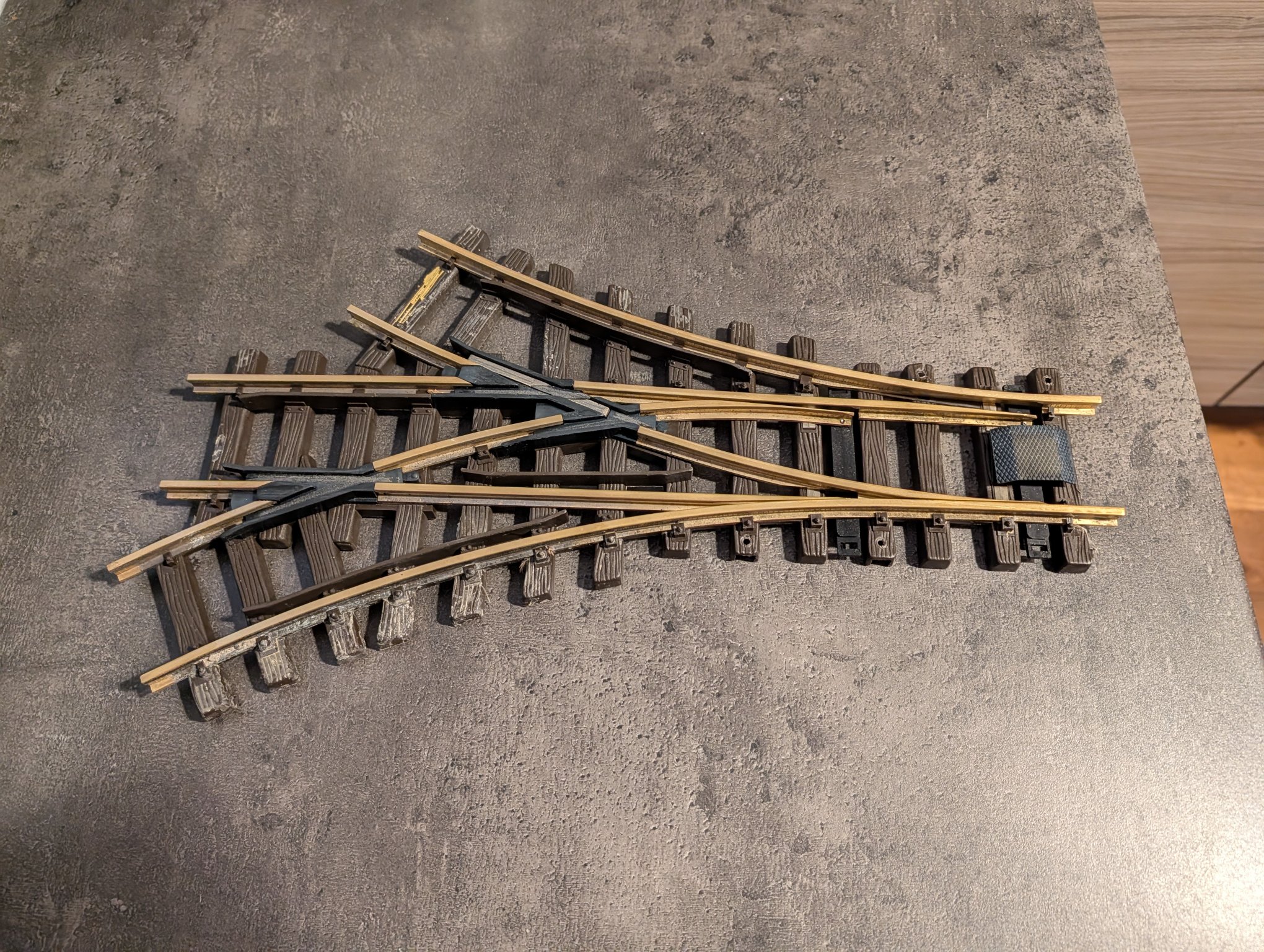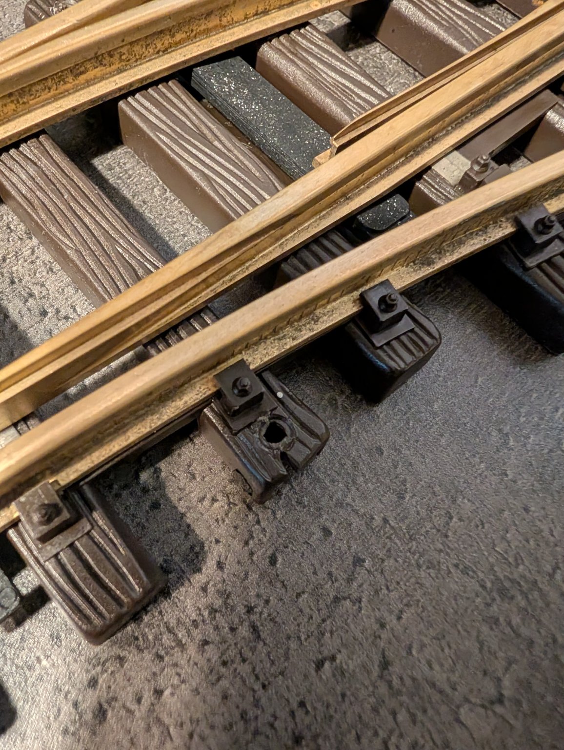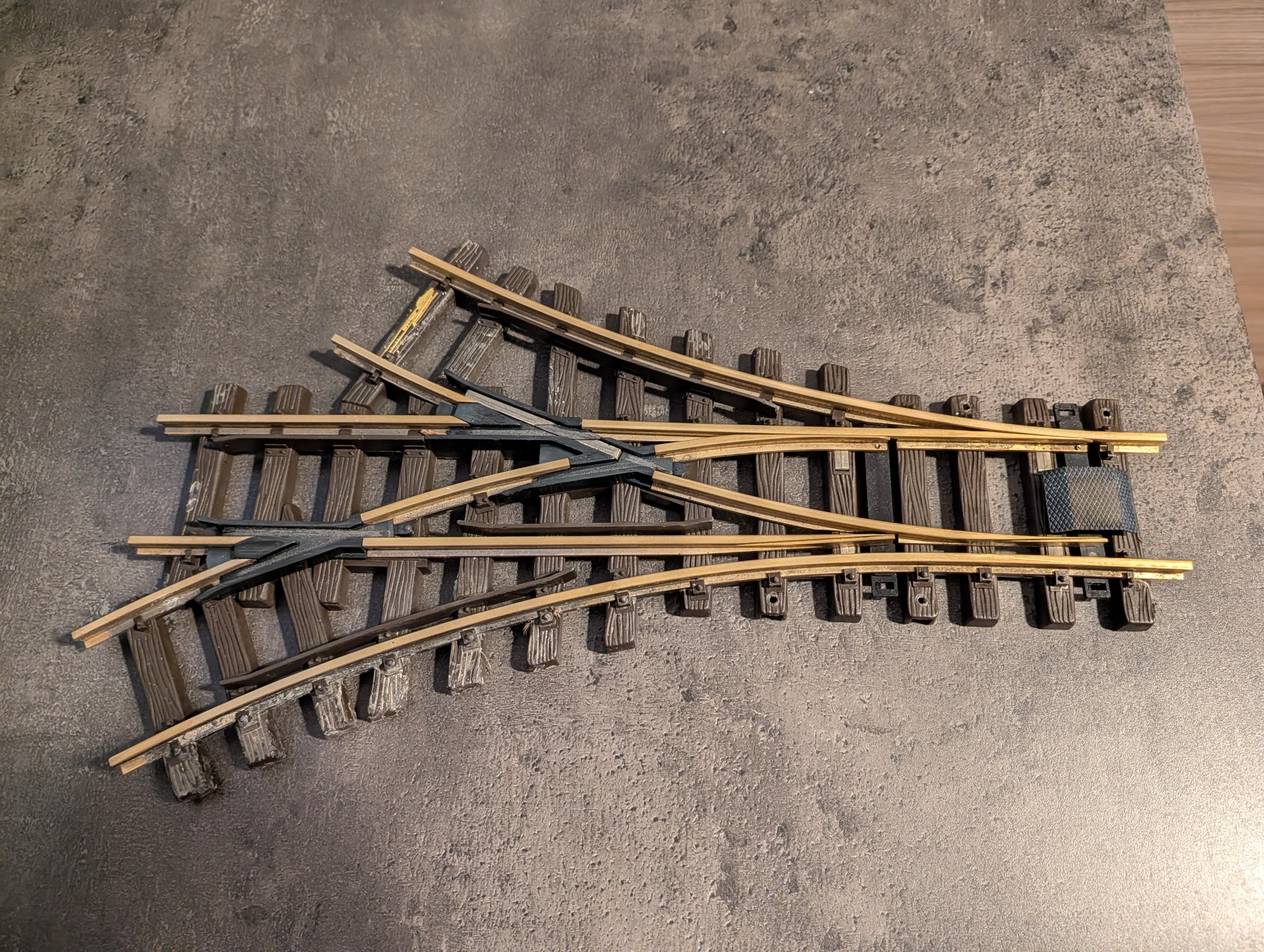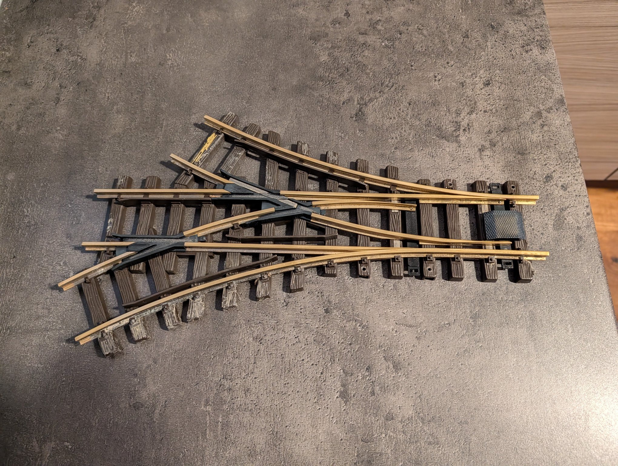 I have for sale, my recently removed 3 way point. Electrically it's all good. All rail chairs are secure. It is used. There are no motors. One of the screw holes that are used to fasten point motors to, have split. See pictures.
