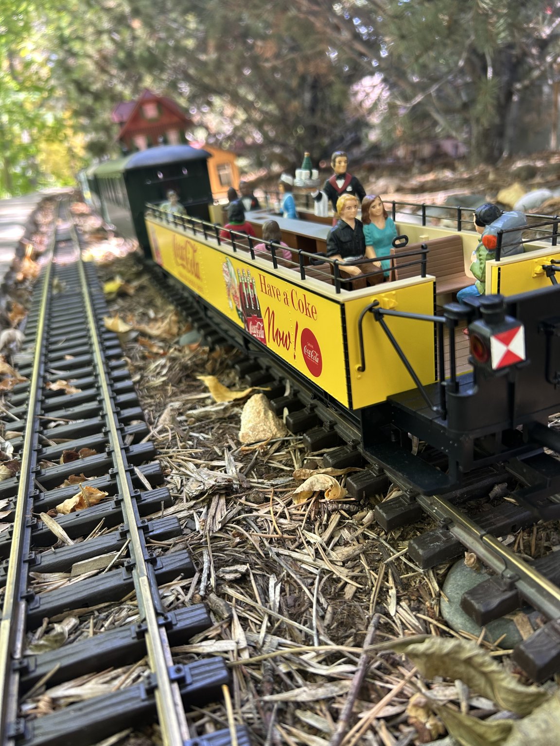Metal wheels, metal handrails along the seating area. Bright, to say the least, graphics and livery. Gates swing open, body has underside detail. Flooring is painted a contrasting color. Tracks like all the other ‘long’ coaches of this marklin/lgb type. Trucks have good details as well. I like it.