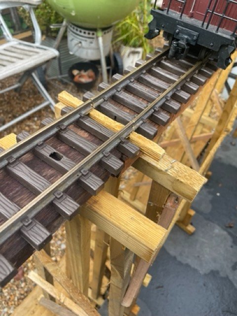 So the trestles are coming on in the garden. I have just done the first lifting bridge. So at one end a hinge which is working ok , at the other end I took a disk cutter and leveled one end so the track sits back flat with it.