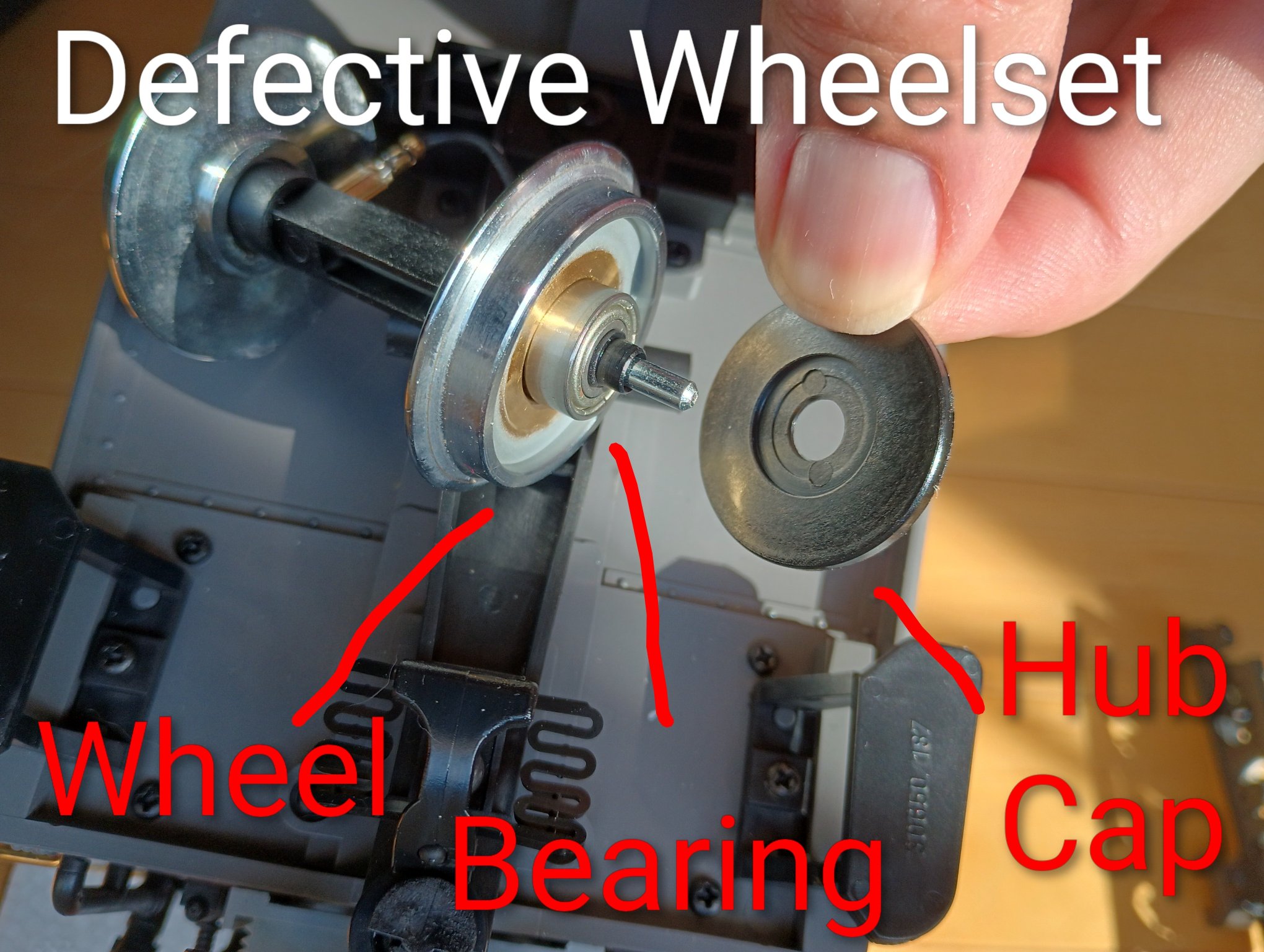 I need to repair an LGB 67403 Ball Bearing Wheelset with power pickups. One of the wheels has detached from the ball bearing and the plastic cap . How were these three elements originally held together from the factory? Were they just friction fit together, or were they glued or otherwise?