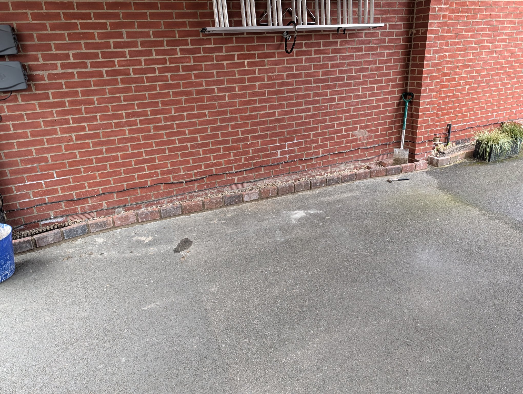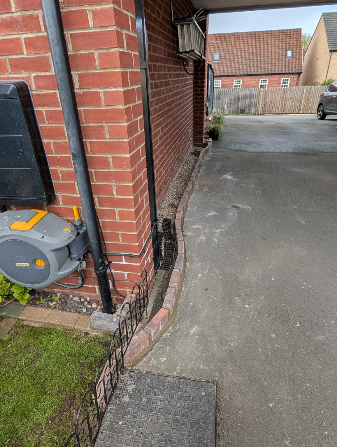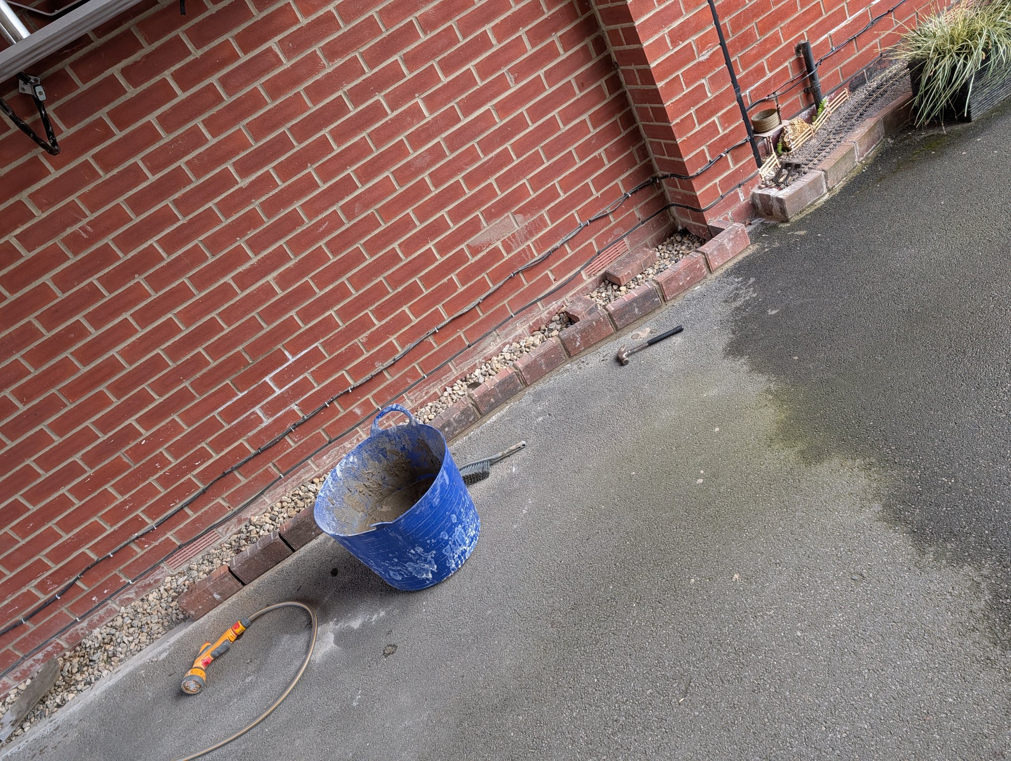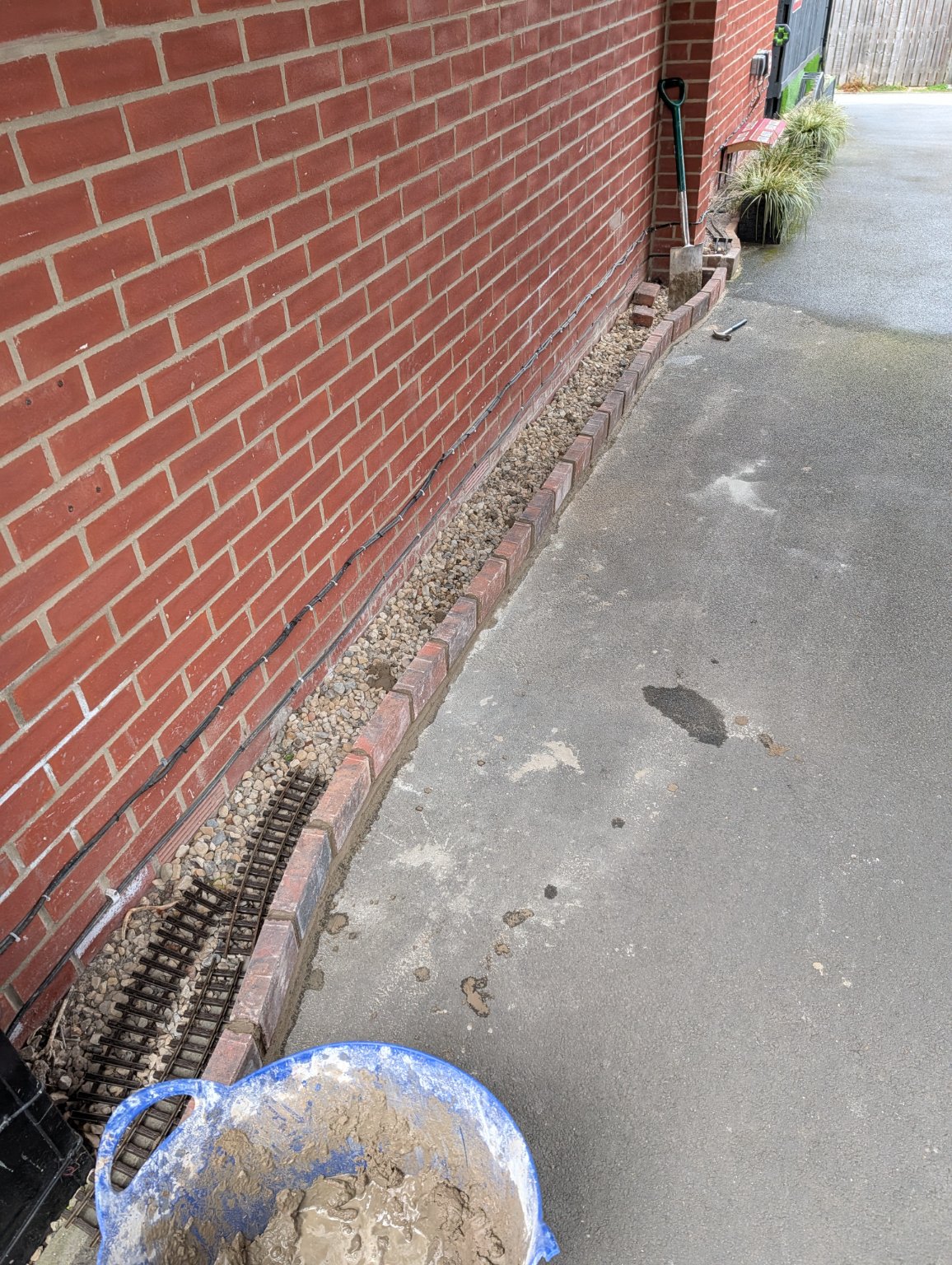Cleaned both cars out today while I could be bothered, but it keeps raining so didn't do the outsides. So, I decided to get my cement mixed and do the brick work to the front garden, so that I can back fill with gravel another day, and get the track laid to at least the grass. The metal railing has been put back temporarily until I decide it's future.