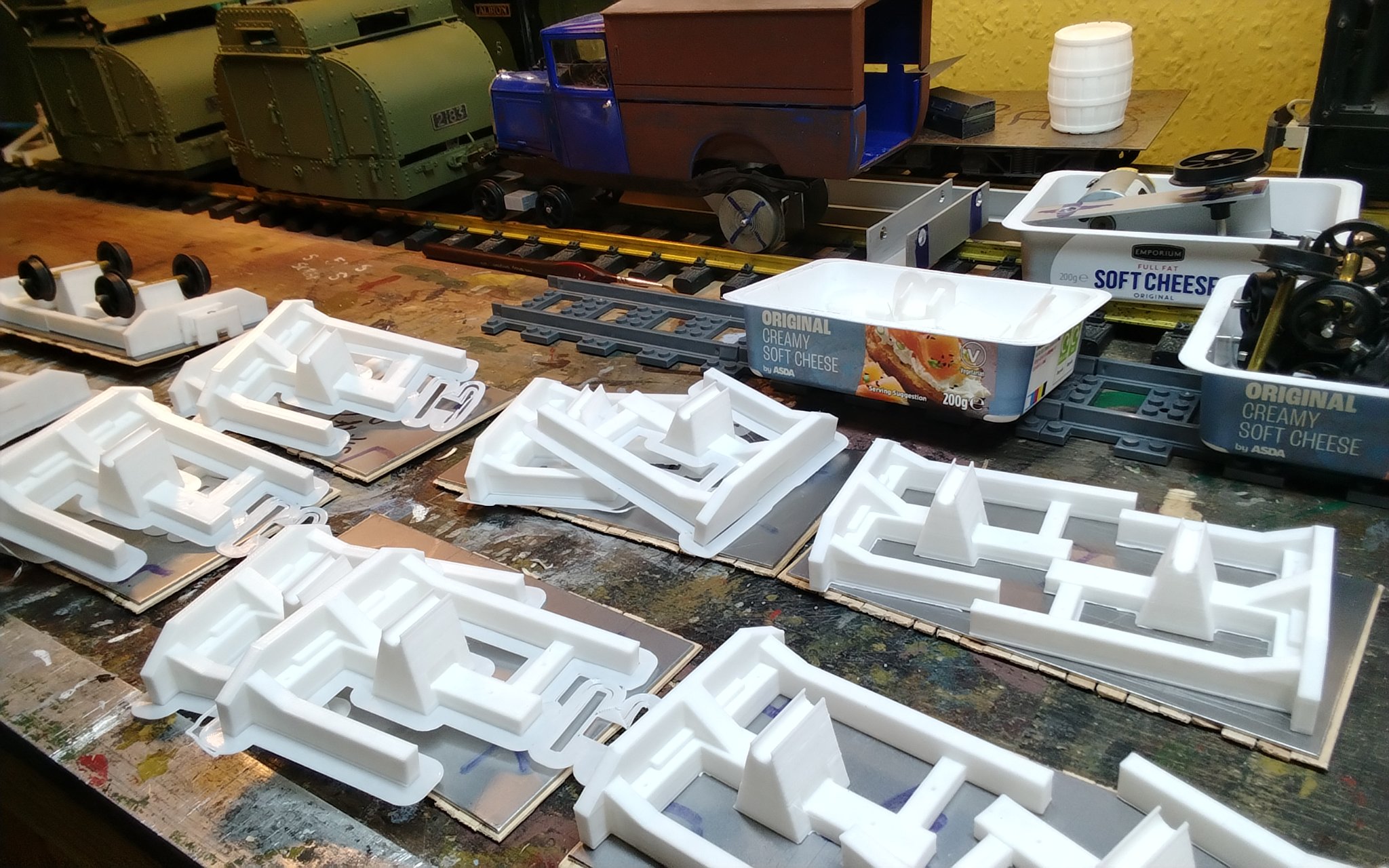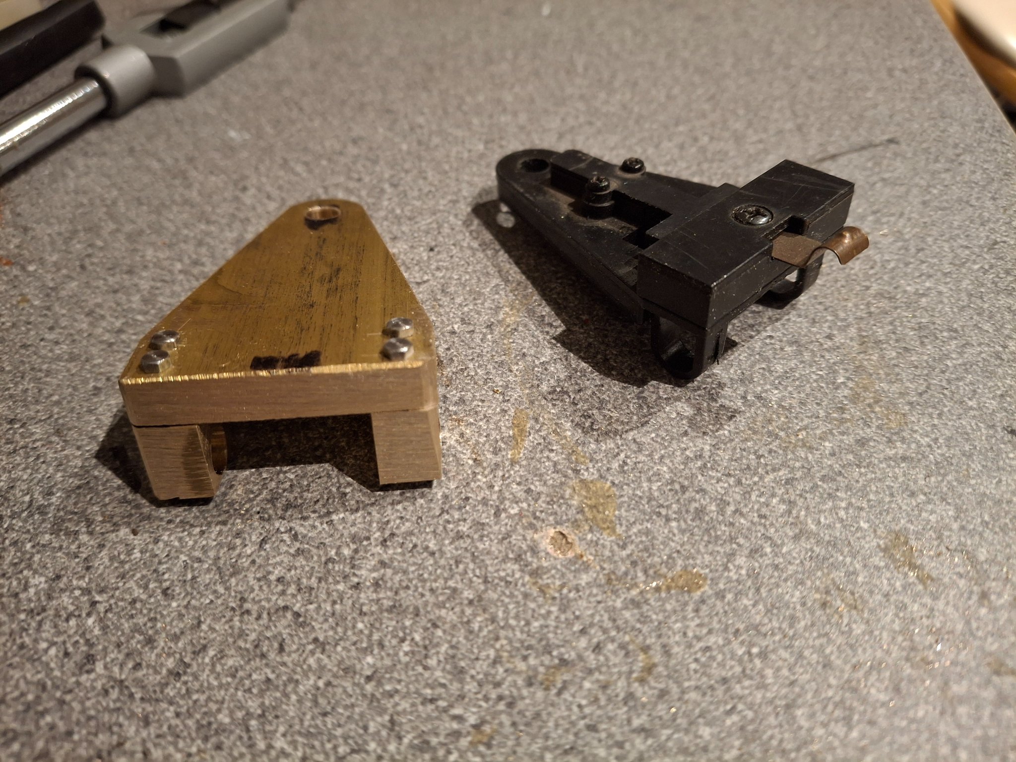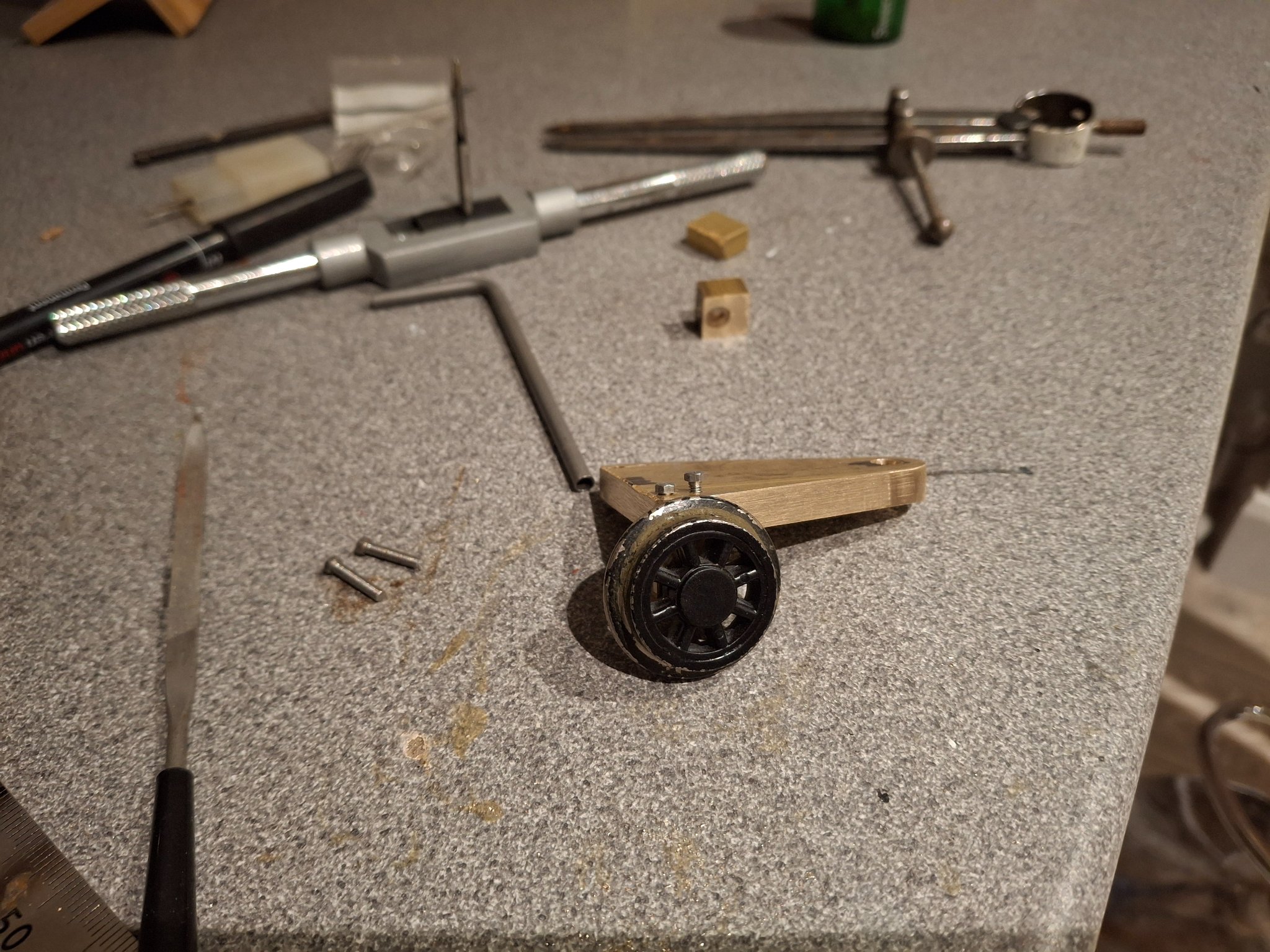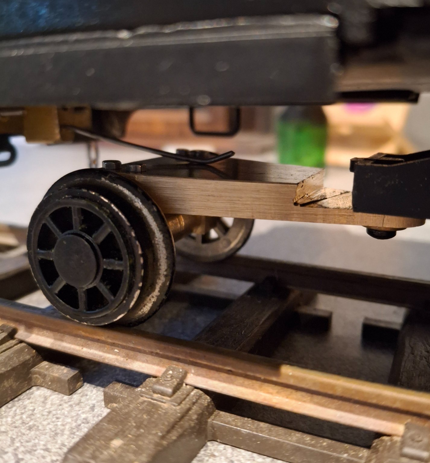 The revised loco runs well smokebox first, but the trailing pony truck (it's an 0-4-2 now) derails on trailing points, rather than throwing the blades across. I decided that it needed a heavier pony truck, the original Bachmann item being fairly thin moulded plastic. And having discovered that the bandsaw will cut brass, I thought I'd see what it thought of the 5mm thick strip I had in stock...