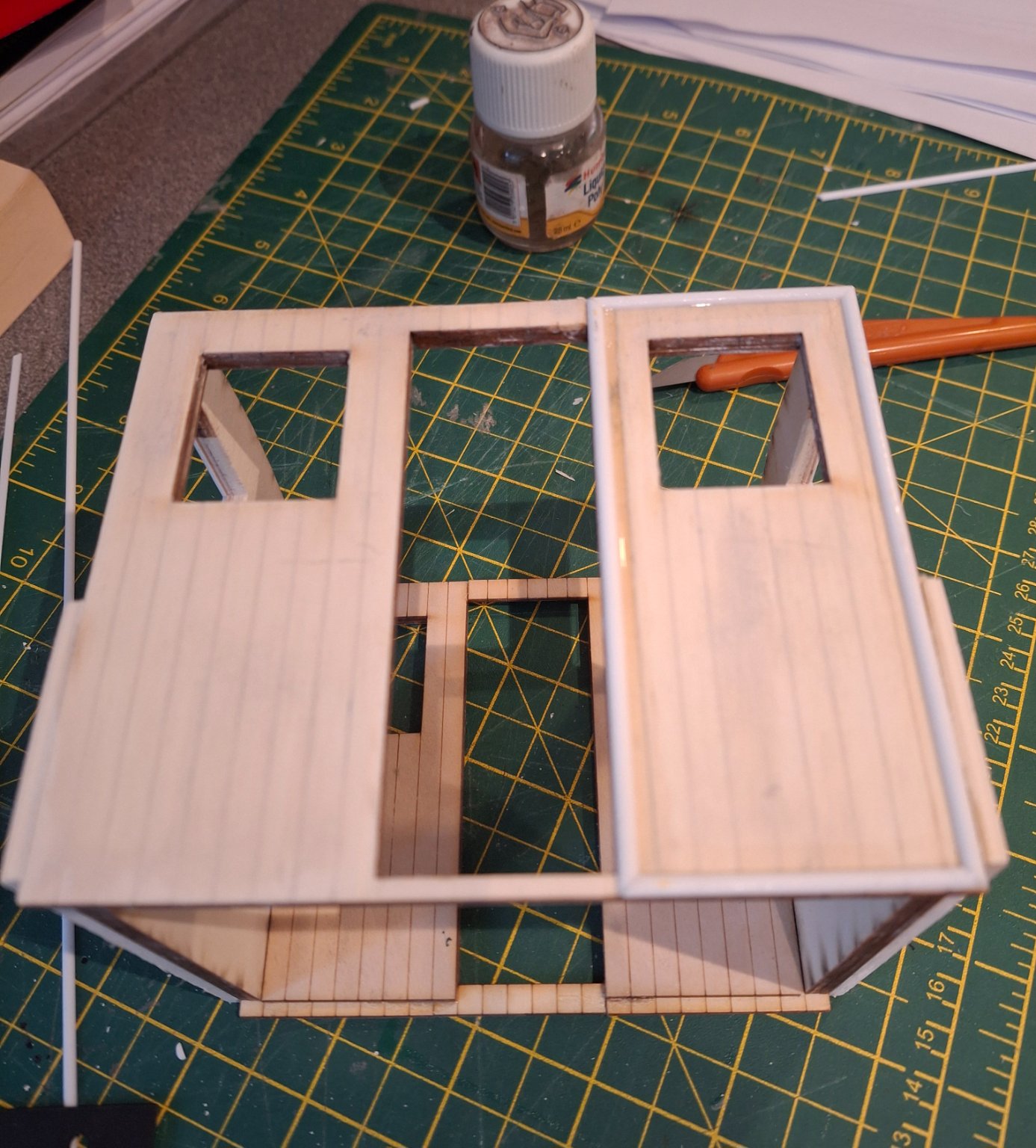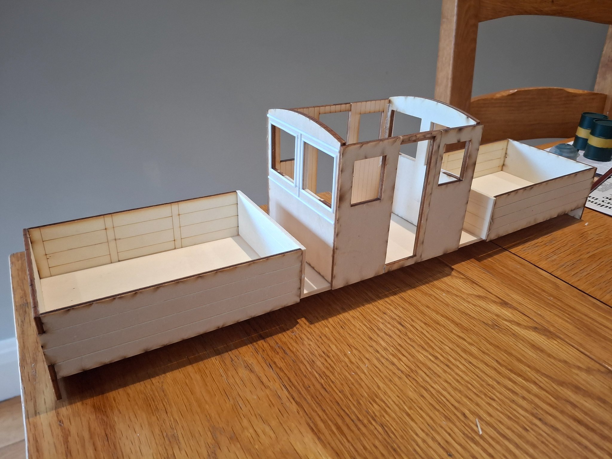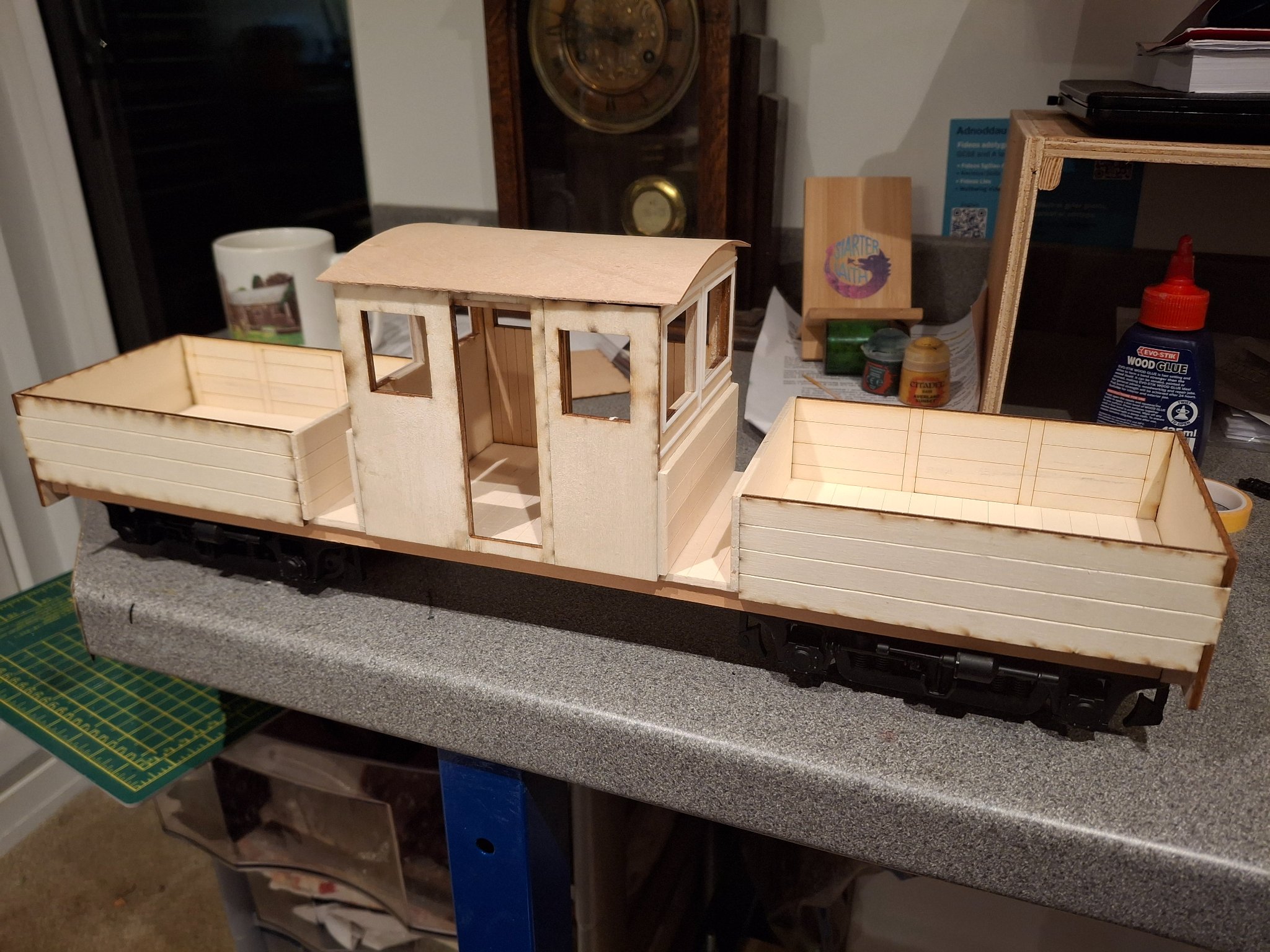 View attachment 350311Next task on the list was to measure, cut and fit the cab roof -serendipitously, I had some spare roof ribs left over from one of my laser cuts that were the same radius. Isn't it good when that happens? I then cut 8mm square softwood strip to size, and made up the underframe -the kit doesn't have this, but it will make everything more rigid and provide a fixing for the bogies/trucks. I then put the cab and its roof in place for a motivation-boosting Assessment Of Progress...