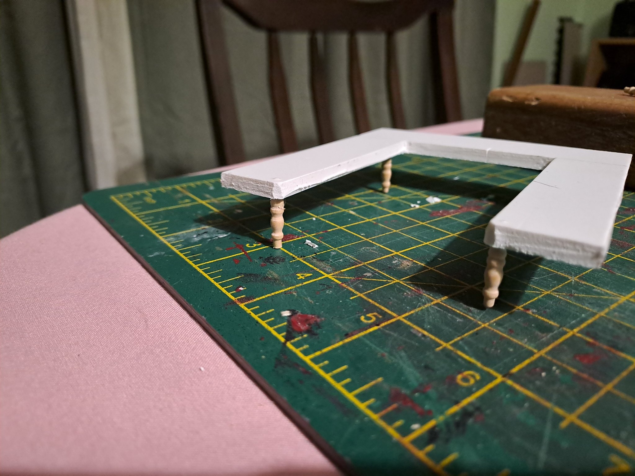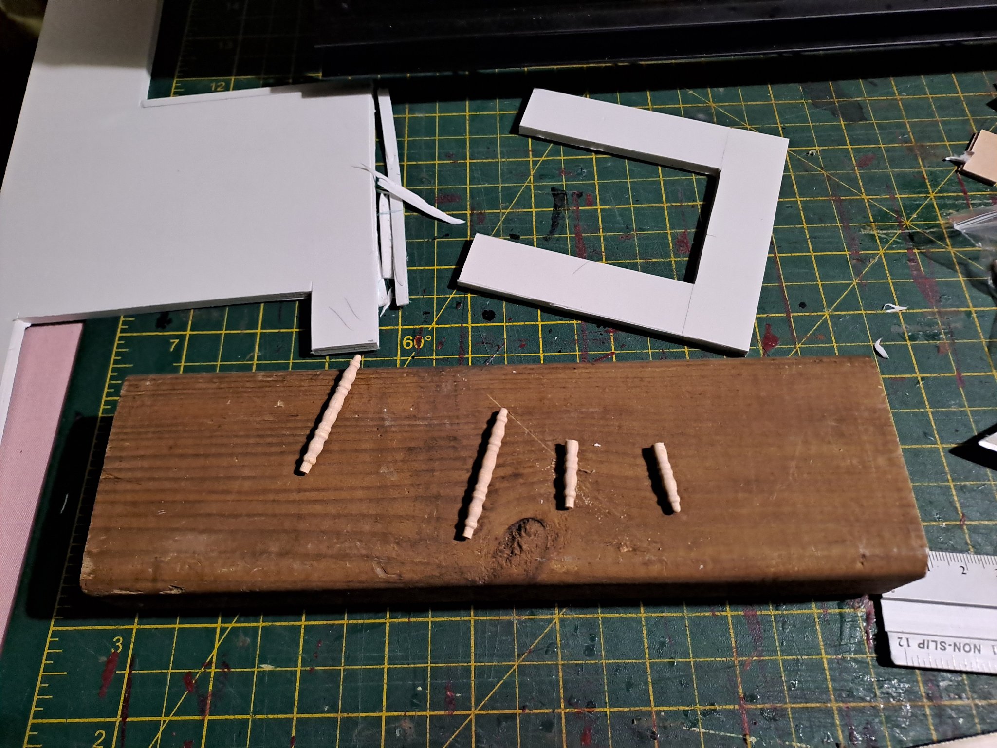 Oh, no one will notice once the roof is on & they are standing 8ft away after a couple of pints on a dark, moonless night...Right, F75 seats! Sawn the spindles in half and using 5mm foam board as the seat base is the way to go, first one done.