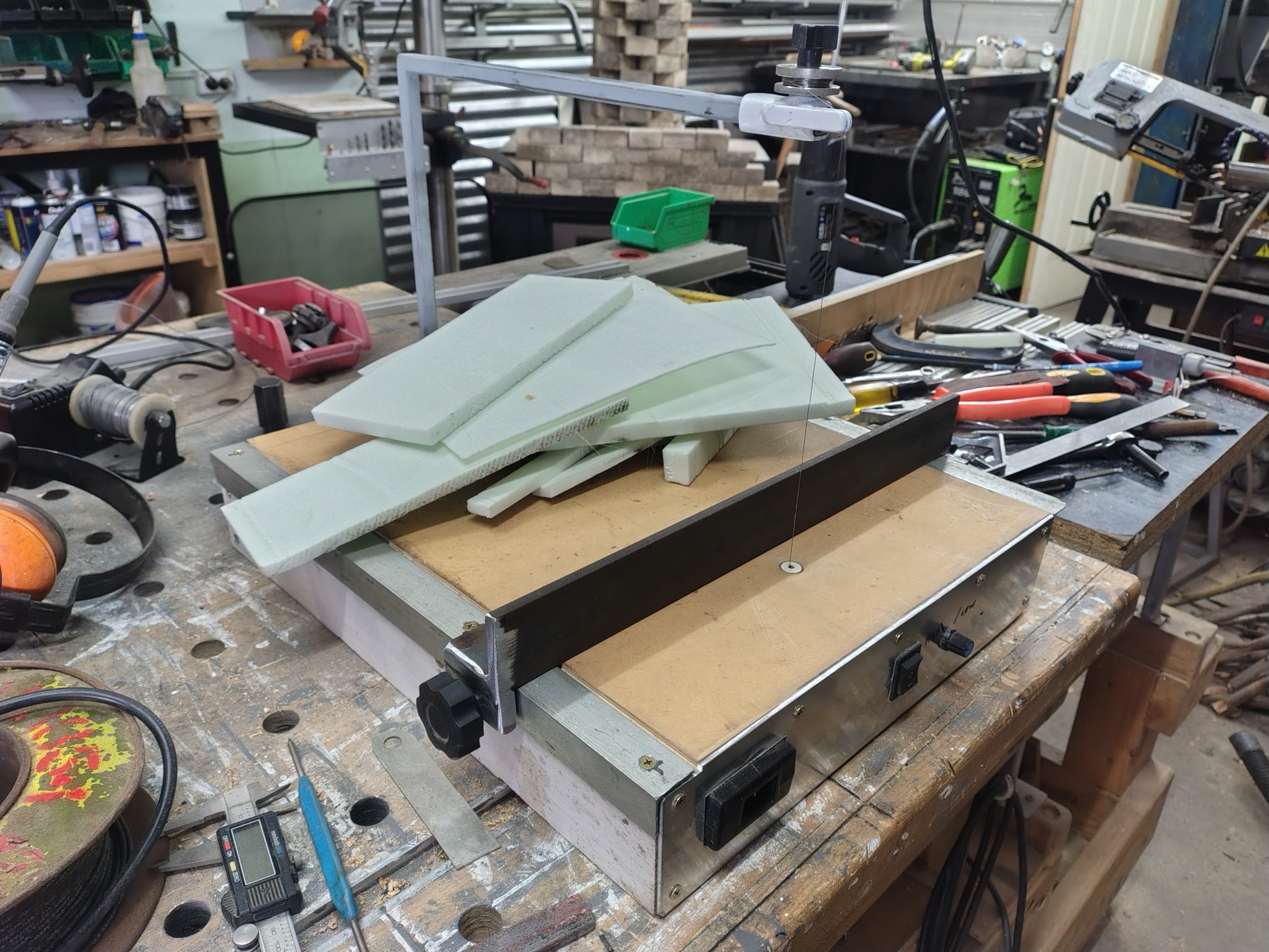 Copied from a Proxon foam cutter, but made larger to suit G scale use, platforms, tunnel mouths, snow shelters, buildings and so on.